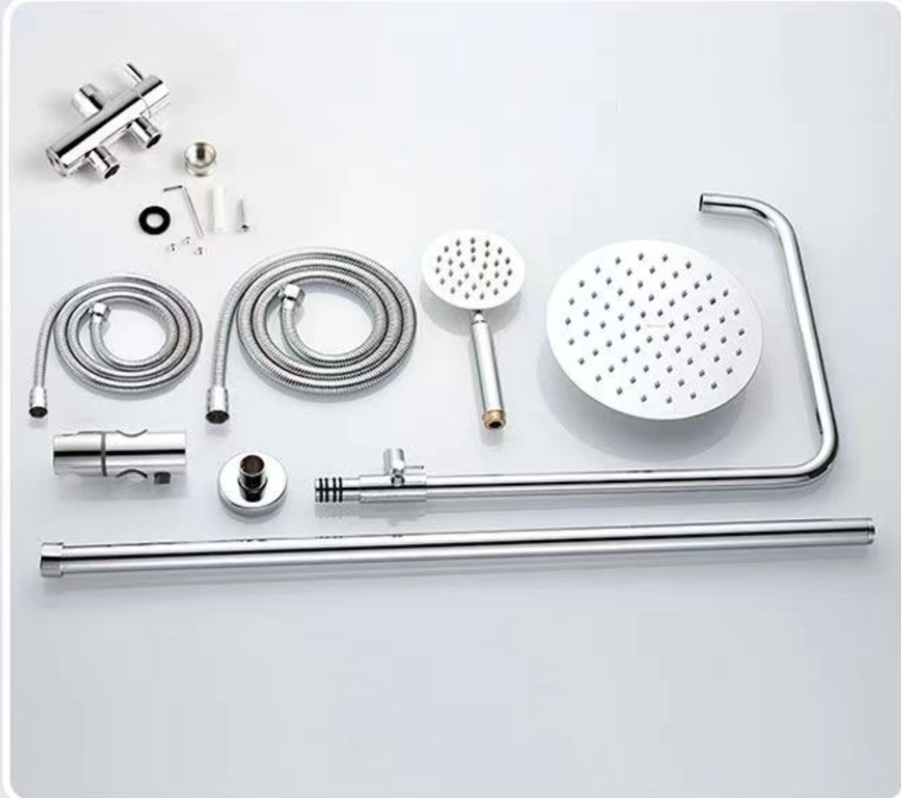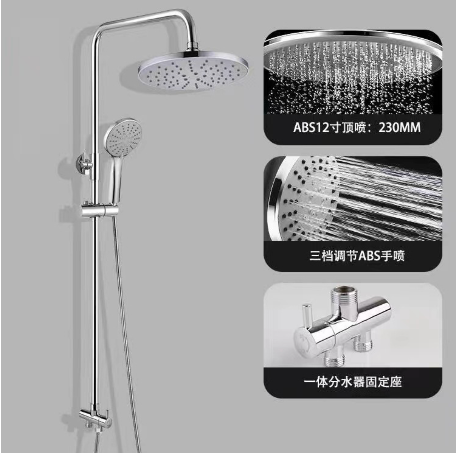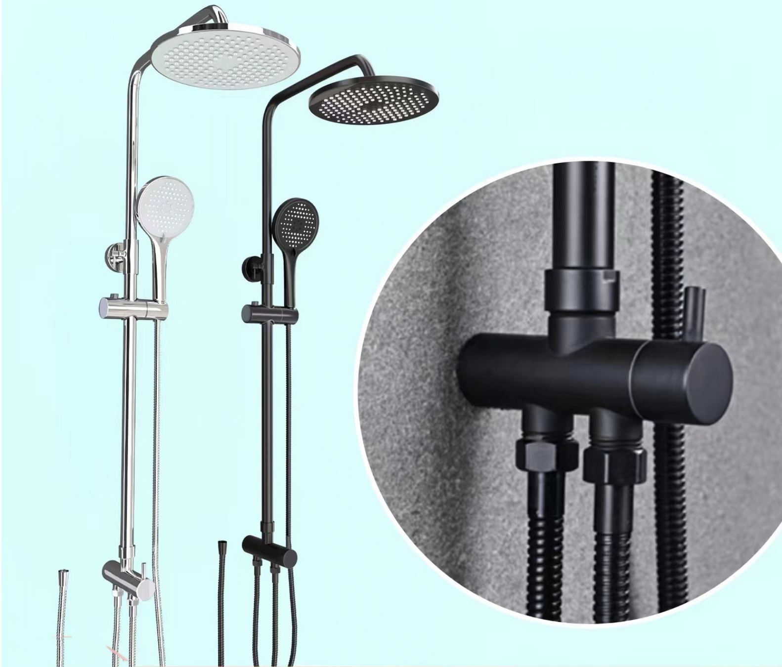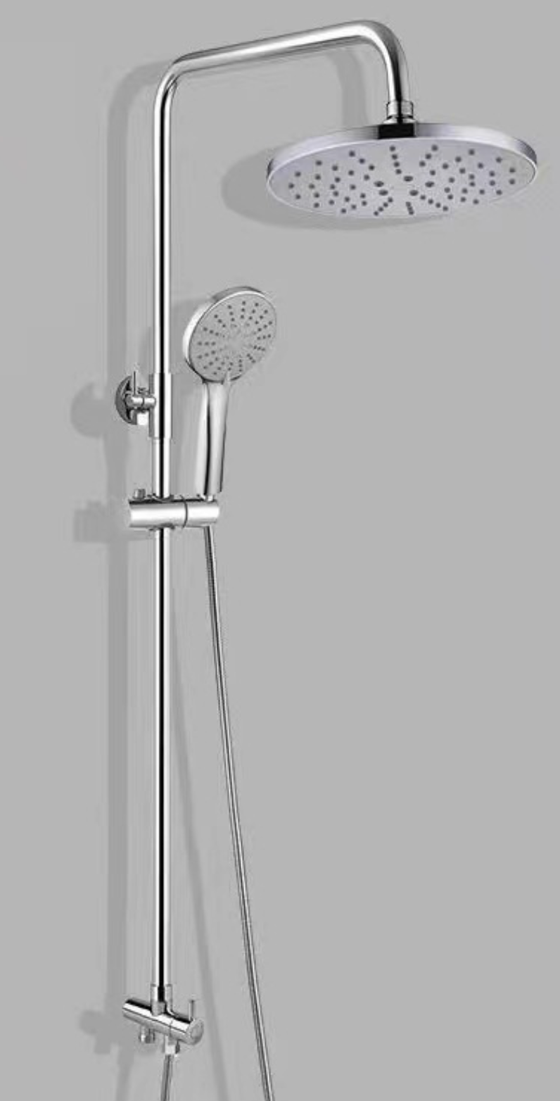 Round shower head combined with round shower rail and hand piece