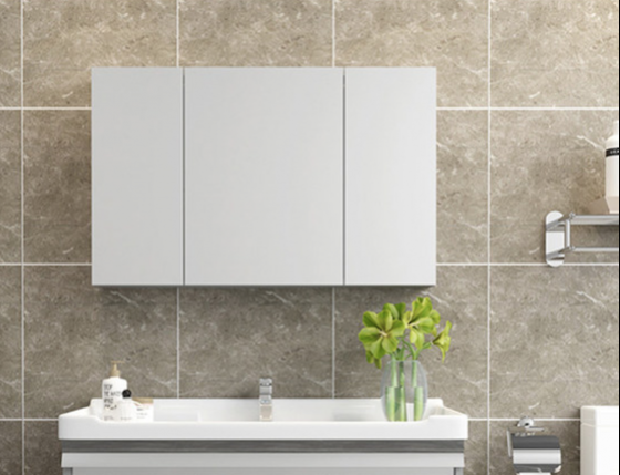 Maximize your bathroom storage with this elegant white mirror cabinet featuring three doors and interior shelving. Crafted from quality plywood with a melamine finish and glass mirror, this versatile cabinet is available in three sizes to suit any bathroom layout.