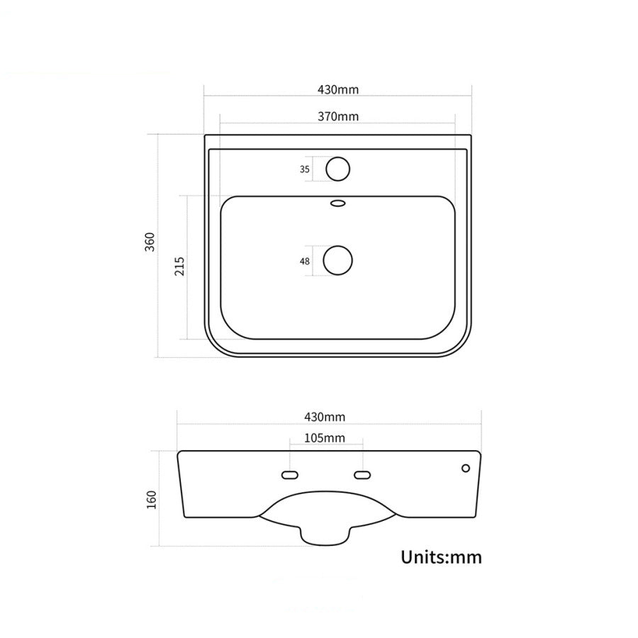 ·Compact vitreous china hand rinse basin ·Standard overflow ·Single tap hole on middle ·32mm waste outlet ·Bowl capacity 1.5L Size :W430xD350XH160MM