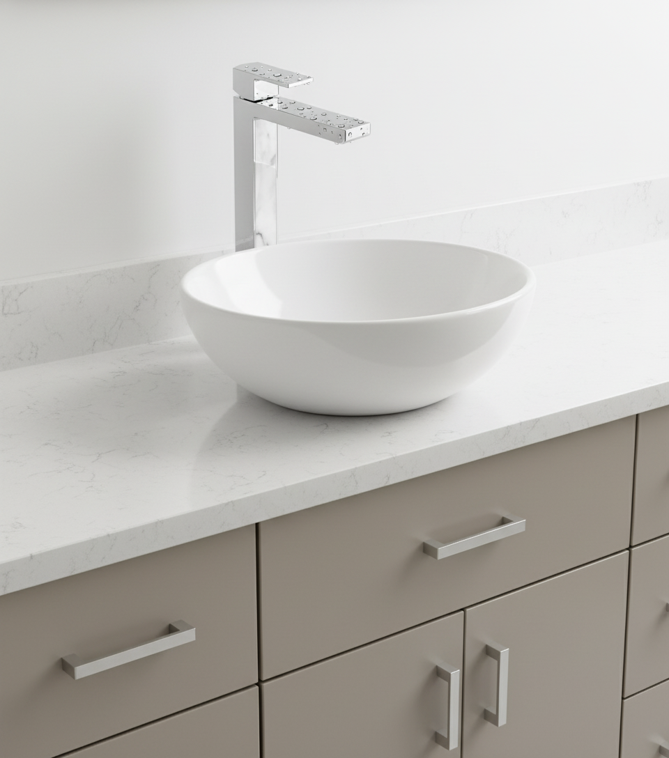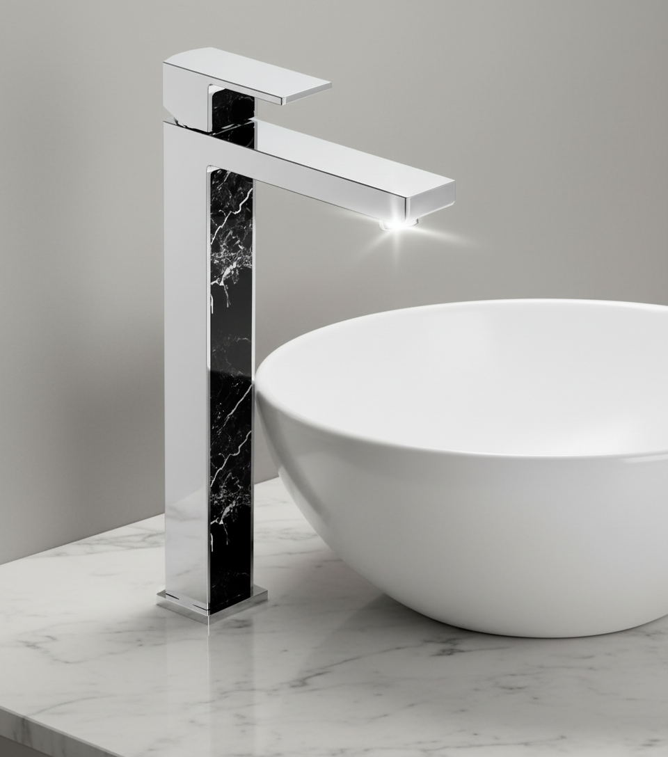 The Elements Vessel Mixer combines modern design with refined materials, featuring an elegant black and white marble trim that adds sophistication to any bathroom. Precision-engineered for smooth operation, this mixer ensures effortless control of water flow and temperature. Its vessel-style design pairs perfectly with above-counter basins, making it a stylish and functional choice for contemporary interiors. Durable construction promises long-lasting performance, enhancing both form and function in your space.
