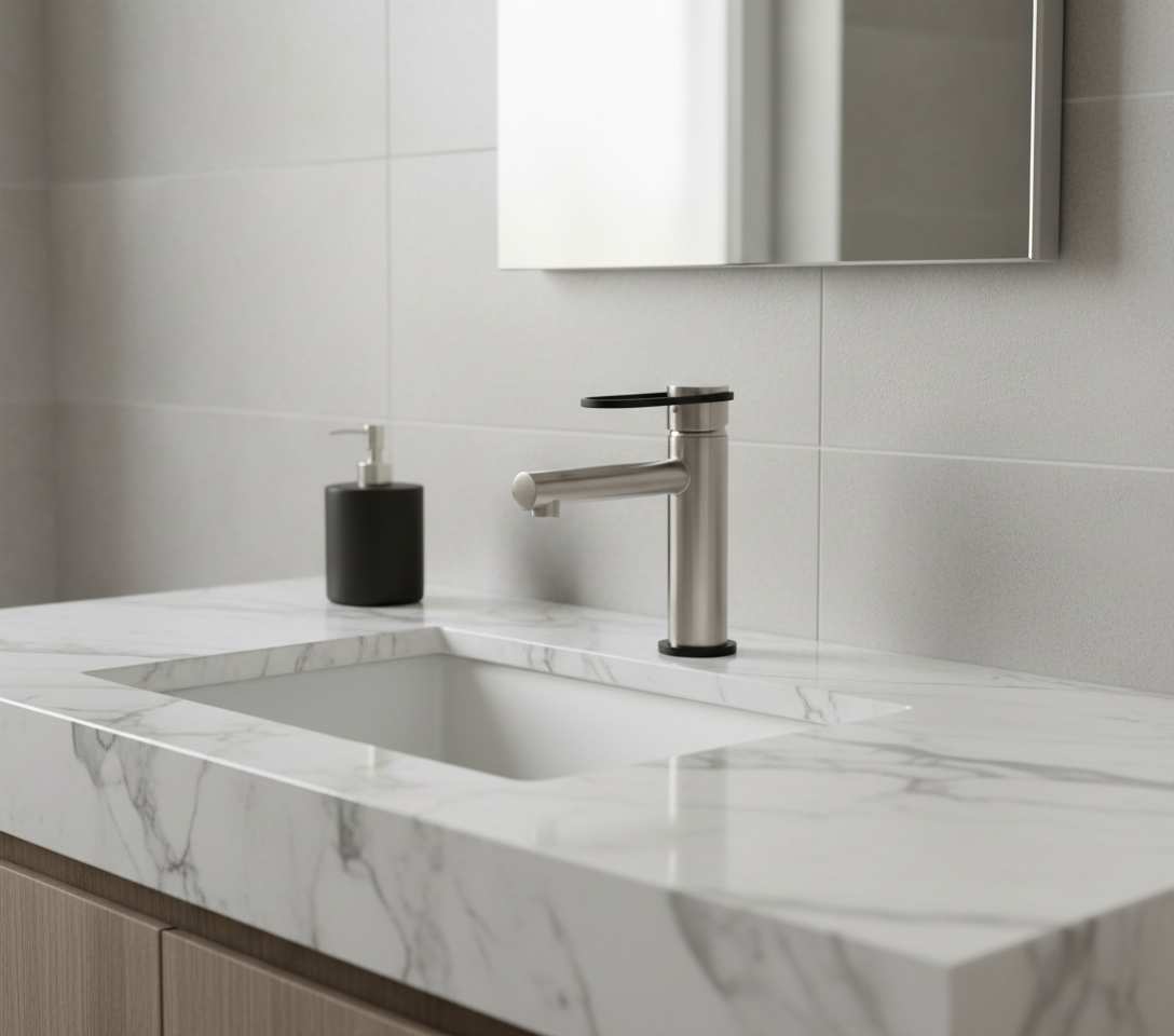 With the texture of a brushed finish contrasting with the matte black, it's a very cool, modern combination. The link mixers are simple and elegant in design but extremely practical as well. Solid handles tend to show all the marks and water droplets. Looped handles, don't show marks as much. Fixed spout. European ceramic cartridge. Other colours available in this mixer are chrome, all black, black-chrome and chrome-black.
