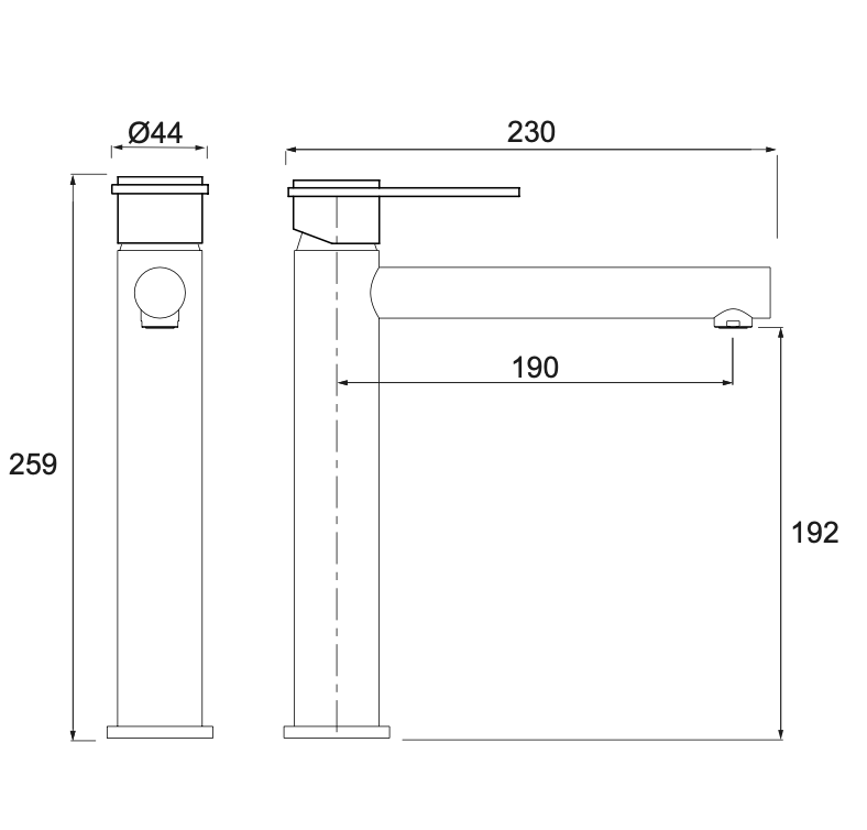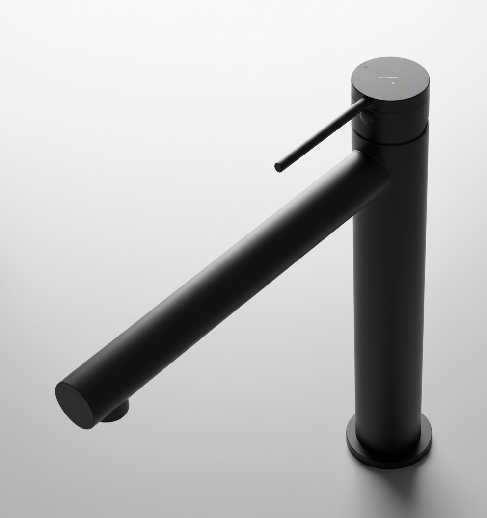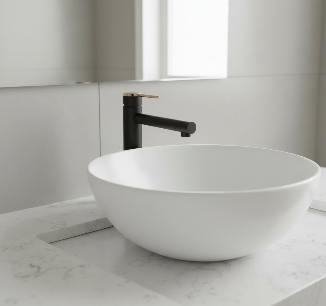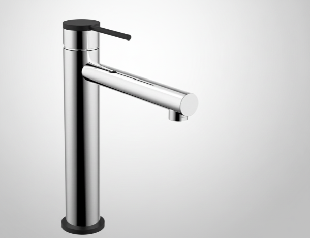 Sleek minimalist black with copper styled handle and base. Electro-plated finish, cylinder shaped vessel mixer. Perfect for mounting behind a raised bowl on the vanity. Quality European ceramic cartridge. German flow regulator.