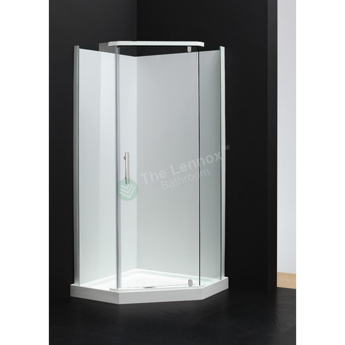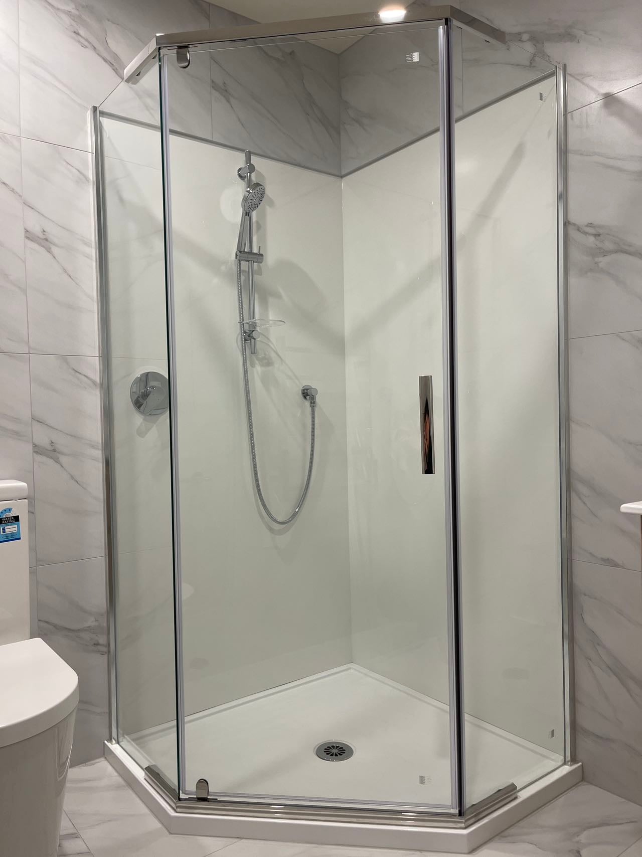Pivot door, reversible polished aluminium frame Seals for water tightness Chrome handle Certified 6mm safety glass AS/NZS 2208 Nano coating easy clean glass |
