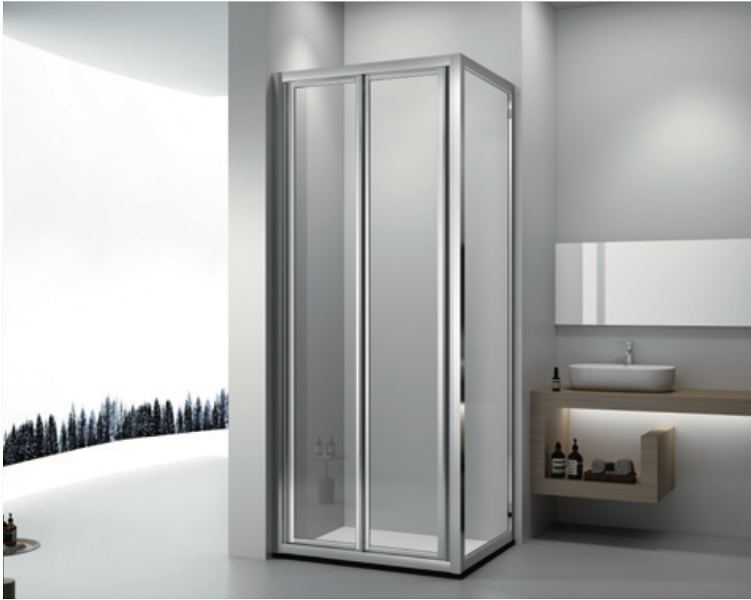 Folding door, reversible polished aluminium frame Seals for water tightness Chrome handle Certified 6mm safety glass AS/NZS 2208 Nano coating easy clean glass |