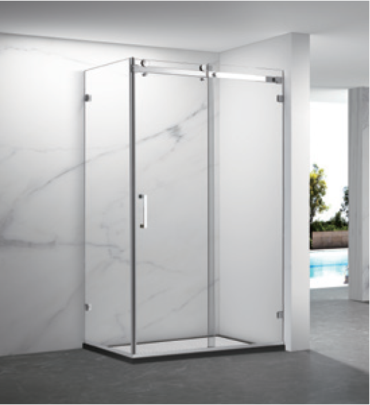 Sliding door, reversible polished aluminium frame Seals for water tightness Chrome handle Certified 8mm safety glass AS/NZS 2208 Nano coating easy clean glass |