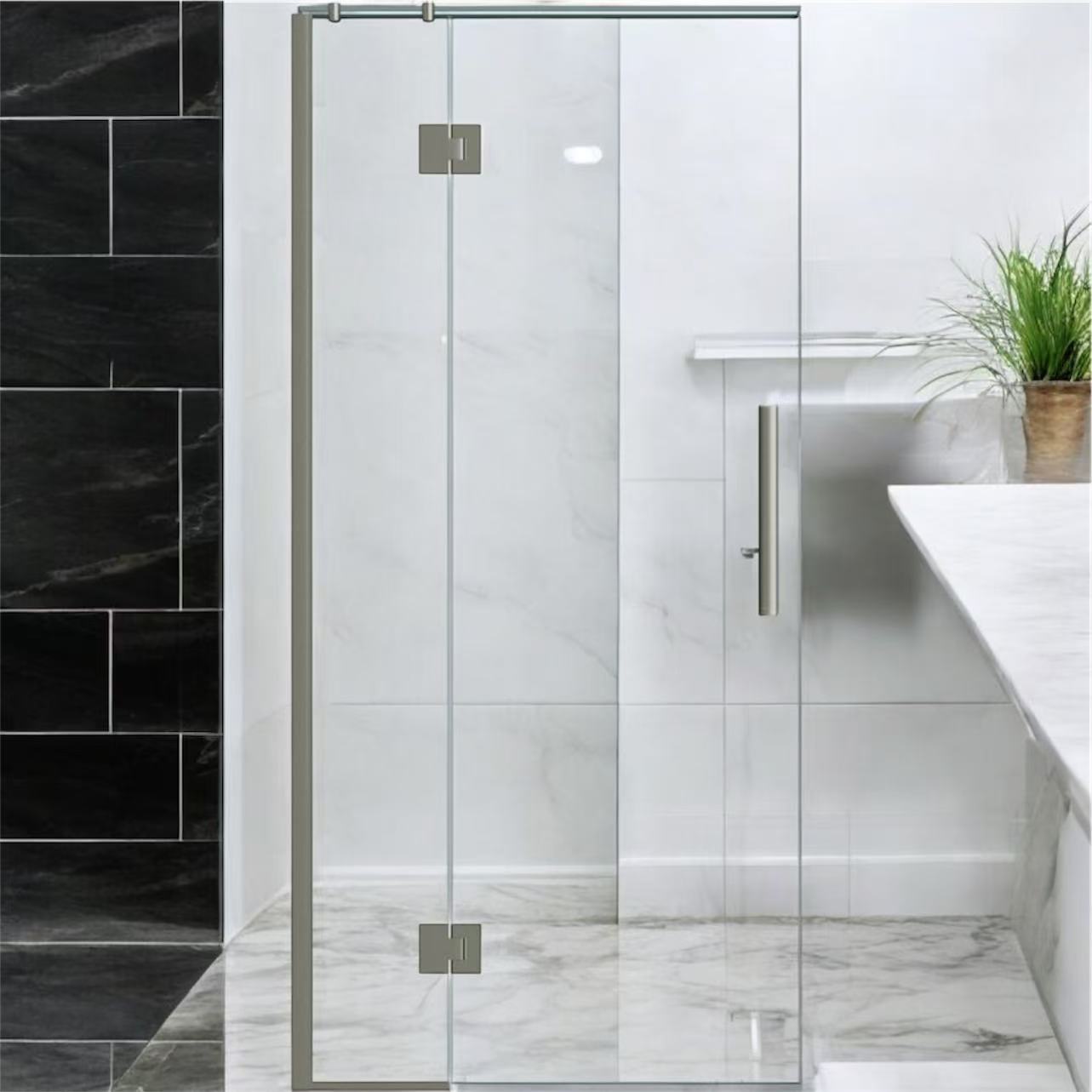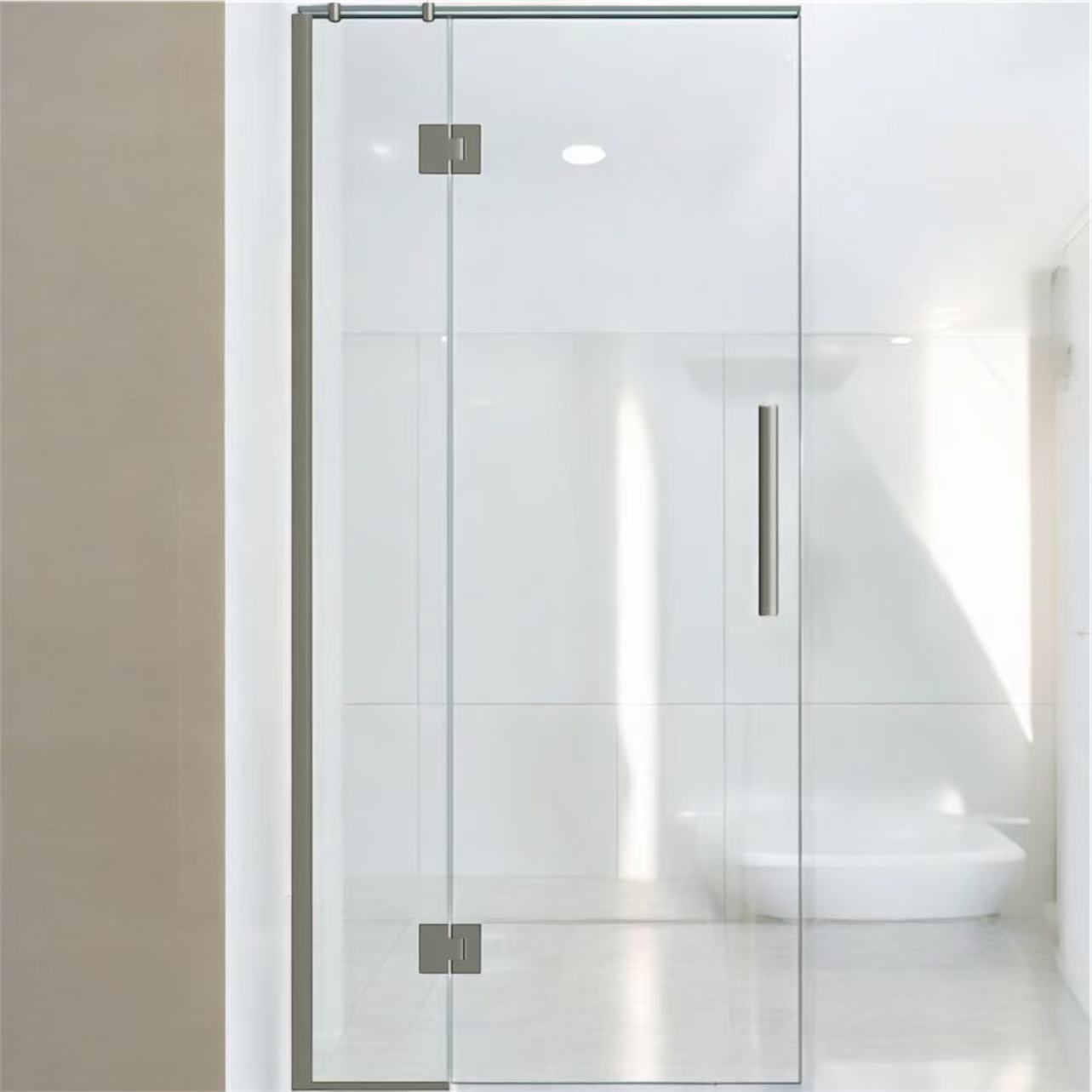 Frameless hinged shower door with in-line glass panel. Suitable for left or right hand installations.