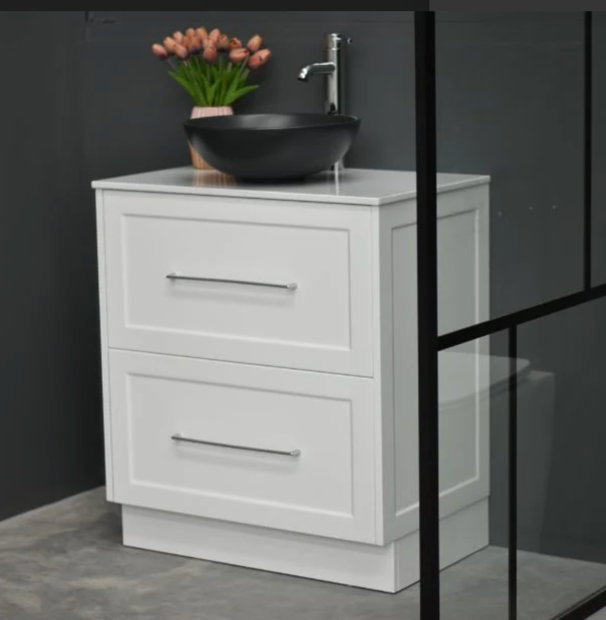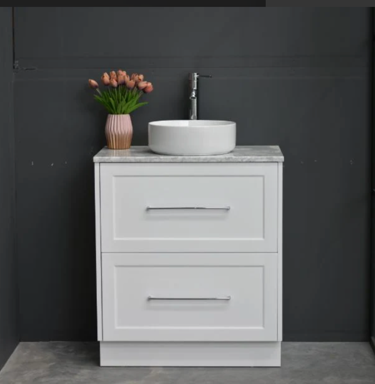 Jess Quartz StoneVanity Set. White Freestanding vanity unit with a Quartz Stone top and soft close drawer. Complete with Ceramic Counter Top Basin.