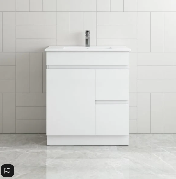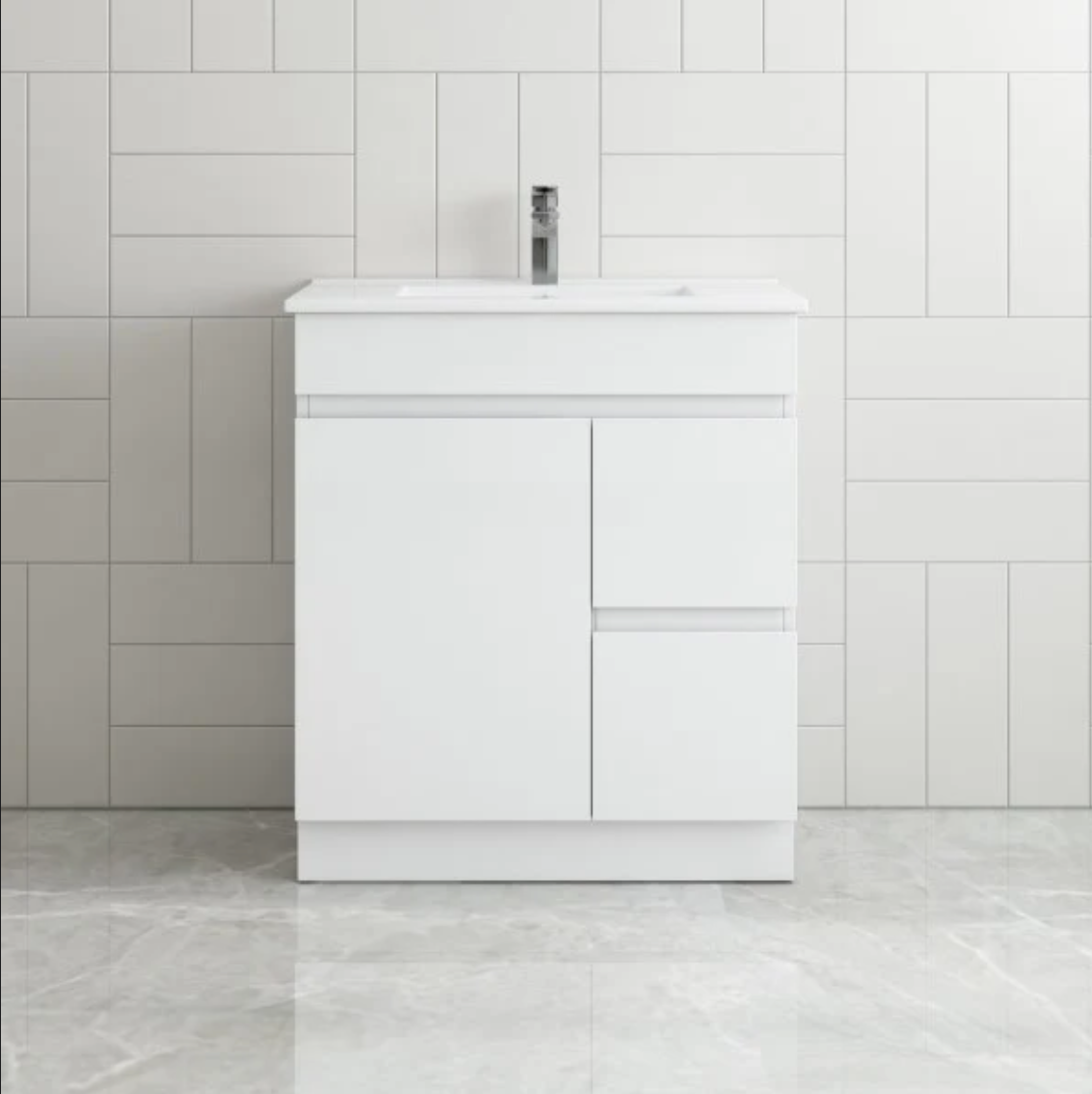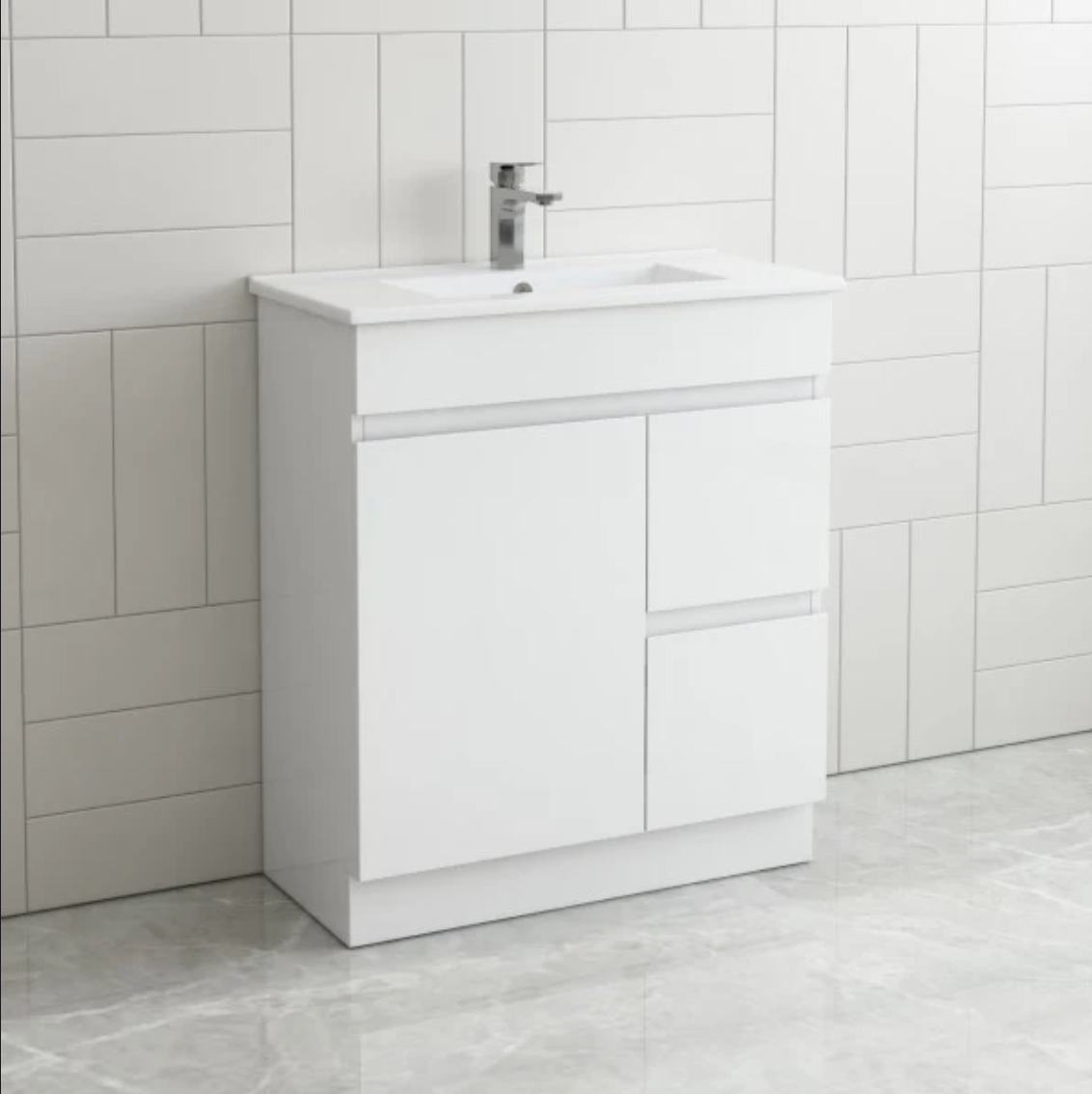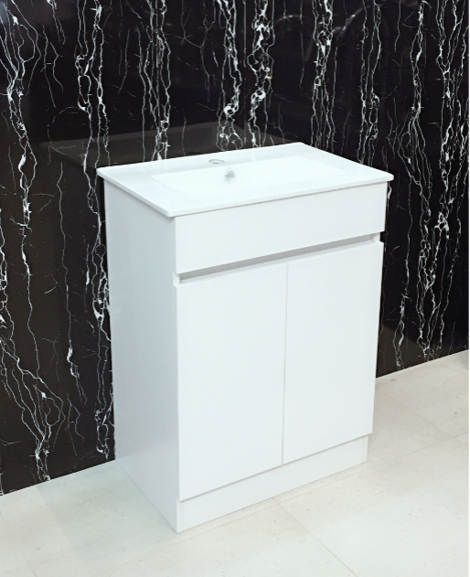 Change the look of your bathroom with this new white colour bathroom free standing vanity cabinet complete with basin and comes 95% assembled. Features beautiful craftmanship, solid strong structure, ceramic china top and bowl, Plywood cabinet, Quality cupboard doors , Pre-drilled for single tap hole