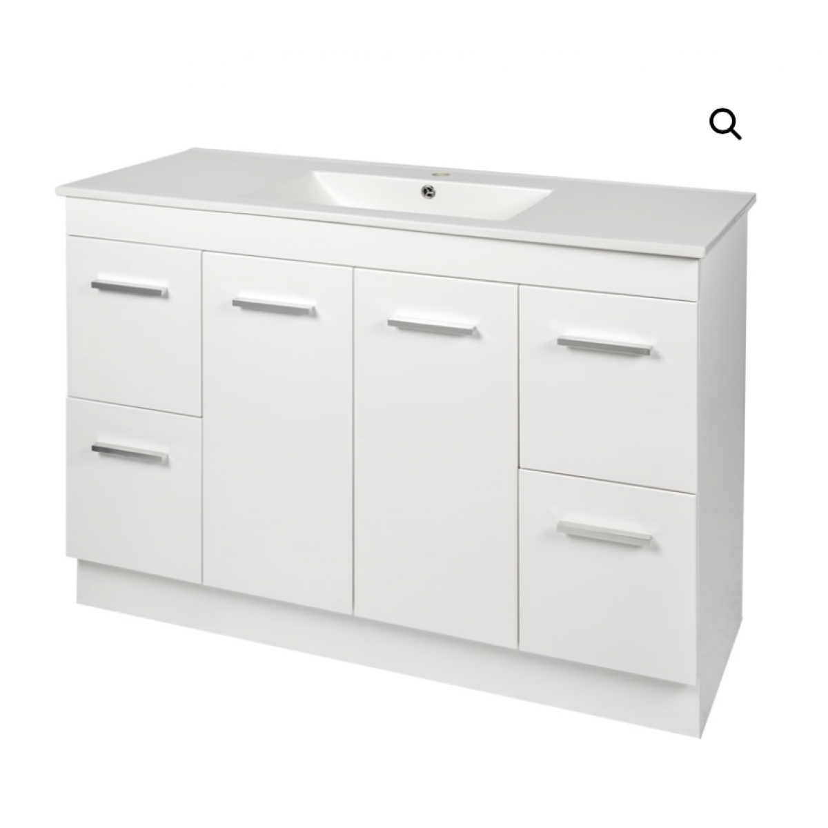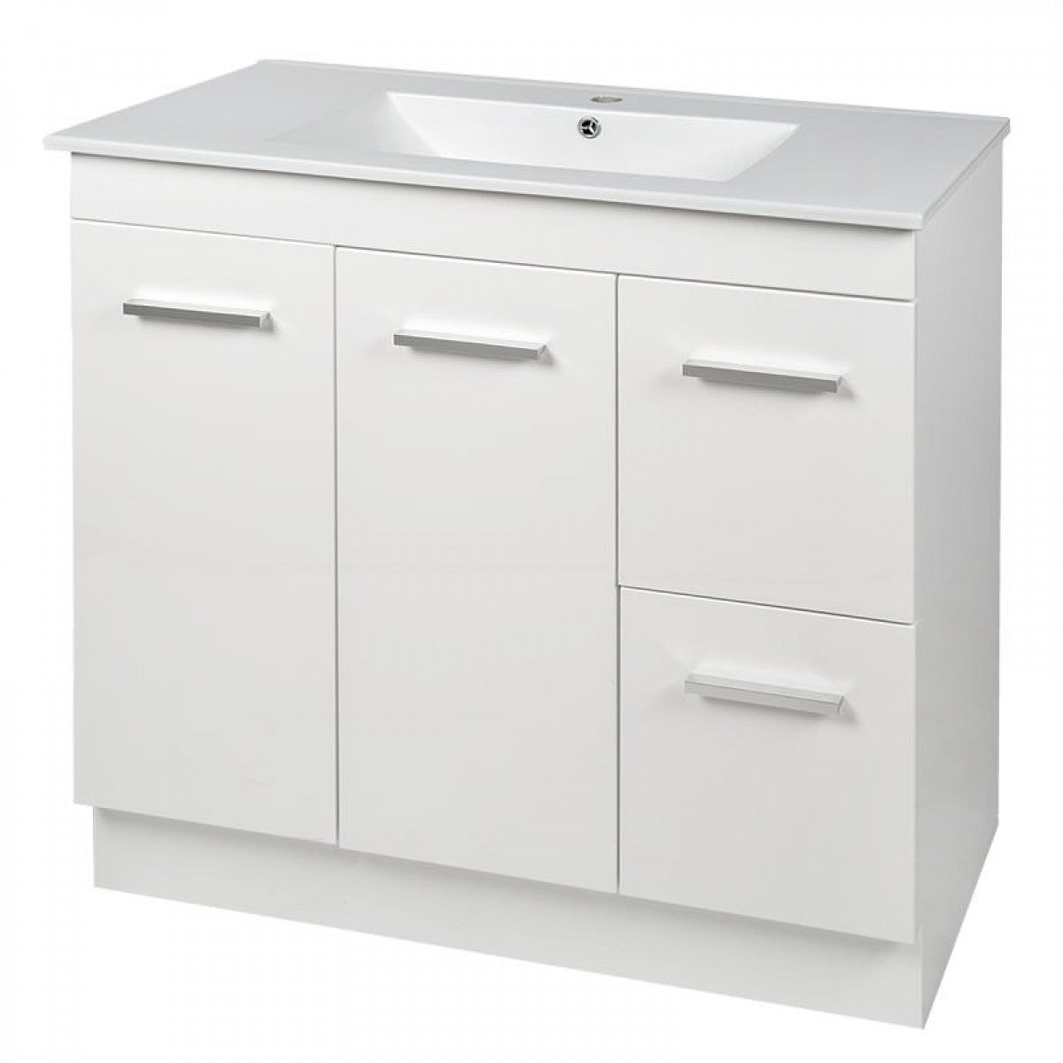 Change the look of your bathroom with this new bathroom full vanity cabinet complete with basin and comes 95% assembled. Features beautiful craftmanship, solid strong structure, ceramic china top and bowl, a huge cupboard with Hydraulic hinge-----soft closing doors and drawers, Pre-drilled for single tap hole. 100% waterproof
