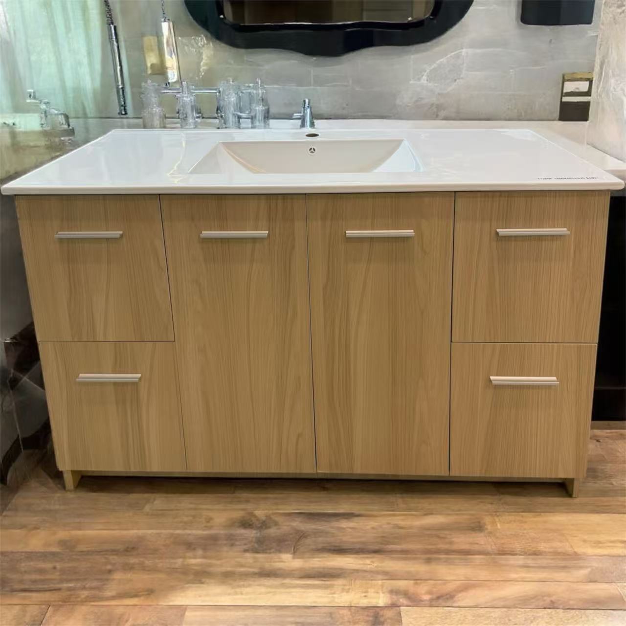 Change the look of your bathroom with this new bathroom full vanity cabinet complete with basin and comes 95% assembled. Features beautiful craftmanship, solid strong structure, ceramic china top and bowl, a huge cupboard with Hydraulic hinge-----soft closing glass doors and drawers, Pre-drilled for single tap hole. 100% waterproof.