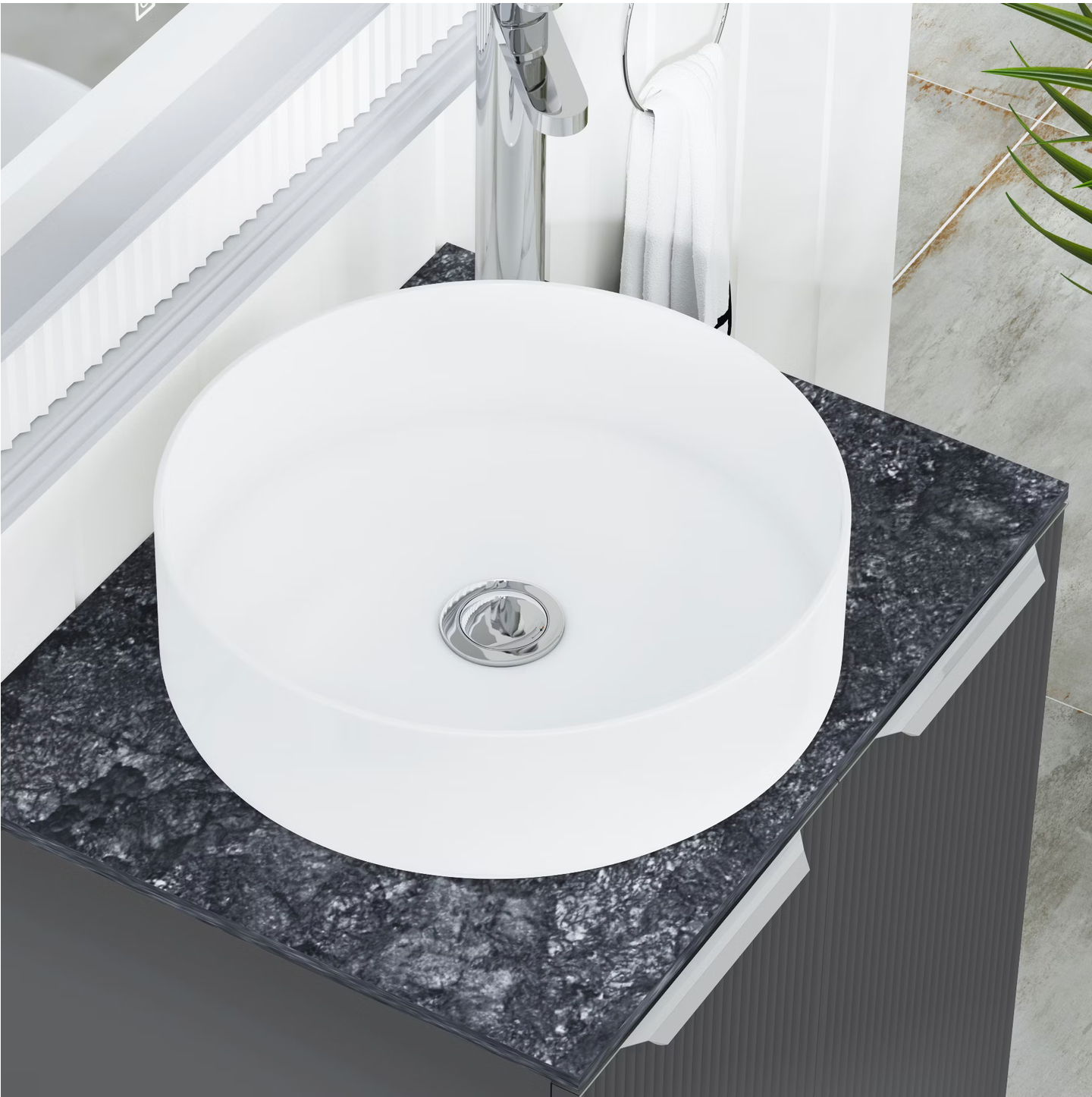Bella Quartz StoneVanity Set. Grey Freestanding vanity unit with a Quartz Stone top and soft close drawer. Complete with Ceramic Counter Top Basin.