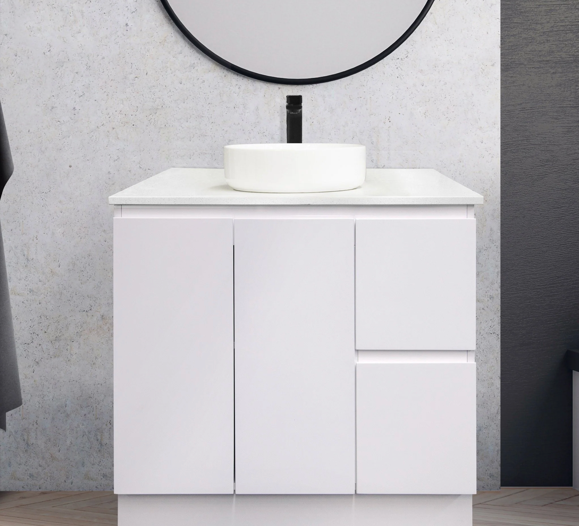 The White Freestanding Vanity with Stone Top, available in 900mm widths, combines classic design with durable materials. Its clean, shaker-style lines provide a timeless look, while the stone top offers a robust and easy-to-maintain surface. This vanity enhances bathroom functionality with ample storage space, promoting organized and efficient use. Ideal for those seeking a sophisticated and lasting addition to their bathroom.