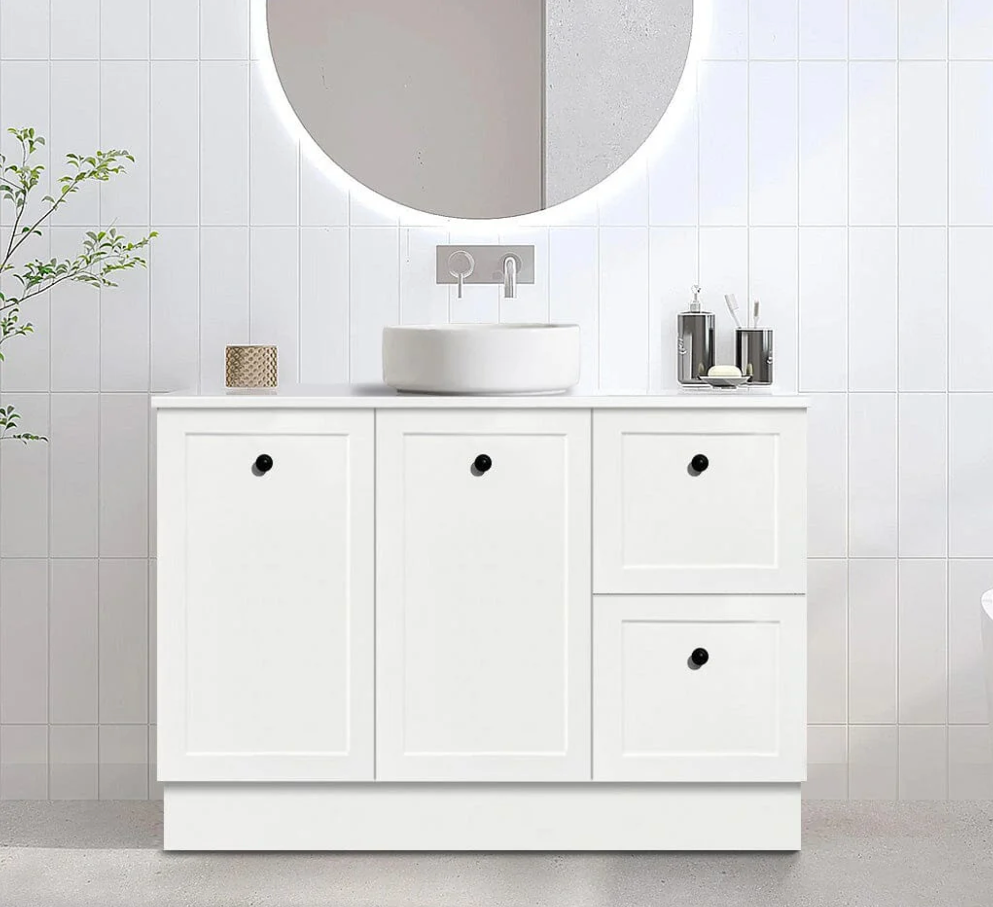 The White Shaker Style Vanity with Stone Top, available in 900mm widths, combines classic design with durable materials. Its clean, shaker-style lines provide a timeless look, while the stone top offers a robust and easy-to-maintain surface. This vanity enhances bathroom functionality with ample storage space, promoting organized and efficient use. Ideal for those seeking a sophisticated and lasting addition to their bathroom.